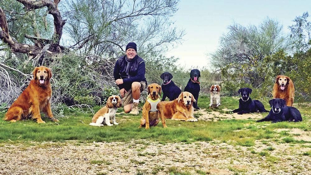 Brian Willis with (from left) Brophy, Ronnie, Pancho, Daisy, Dunbar, Winston, Boomer, Tillman, Tiberius and Dingo.